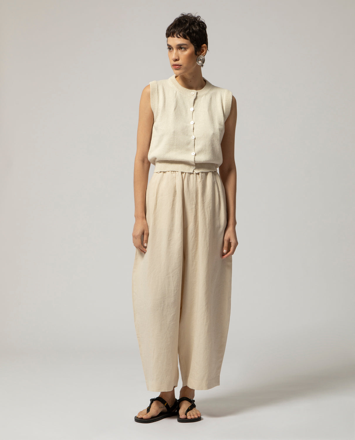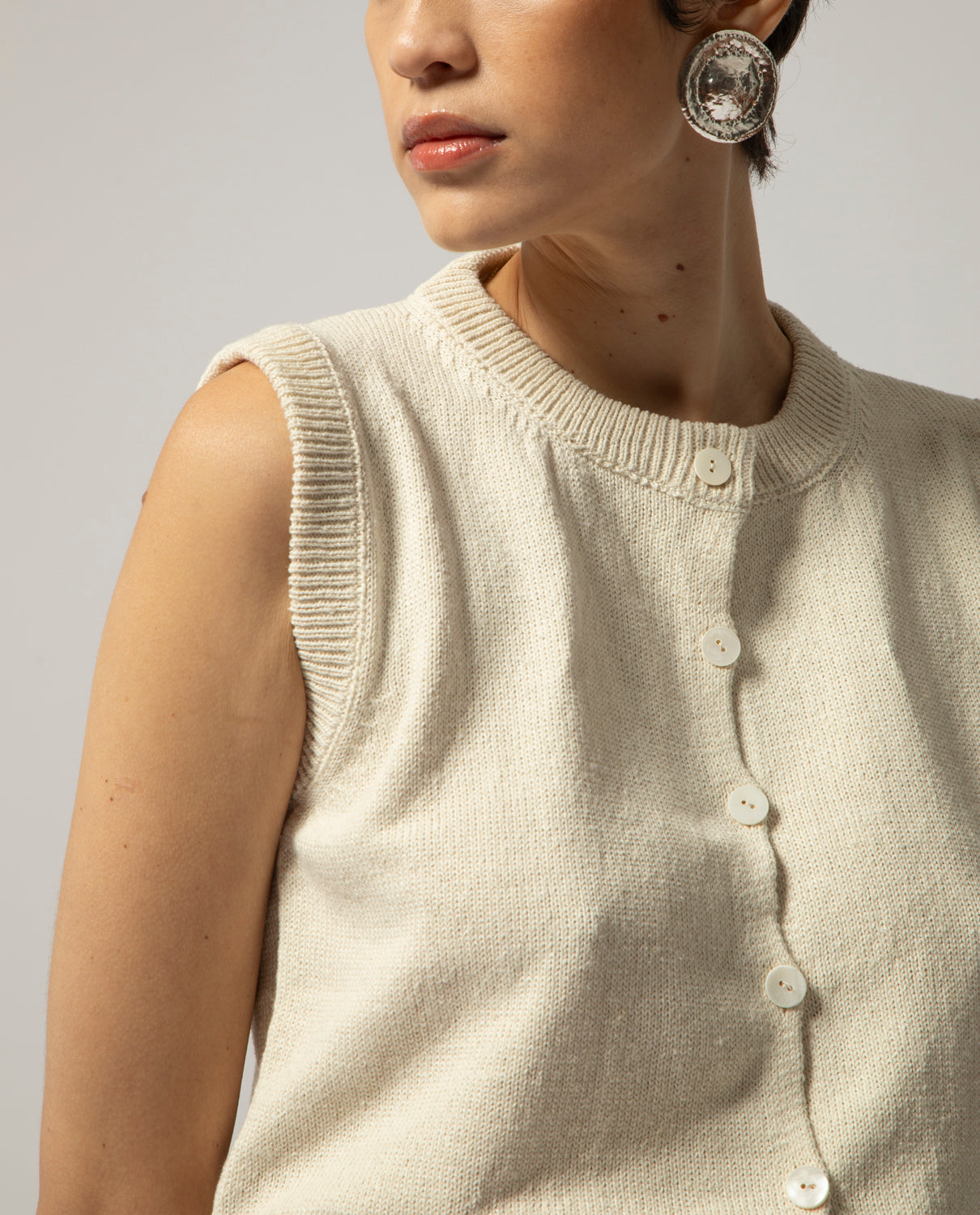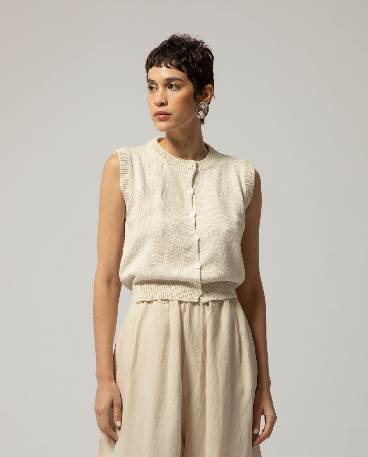 Sleeveless knitted gilet in hemp and silk with elagstic waistband, rounded neckline and front opening with small buttons line-up.