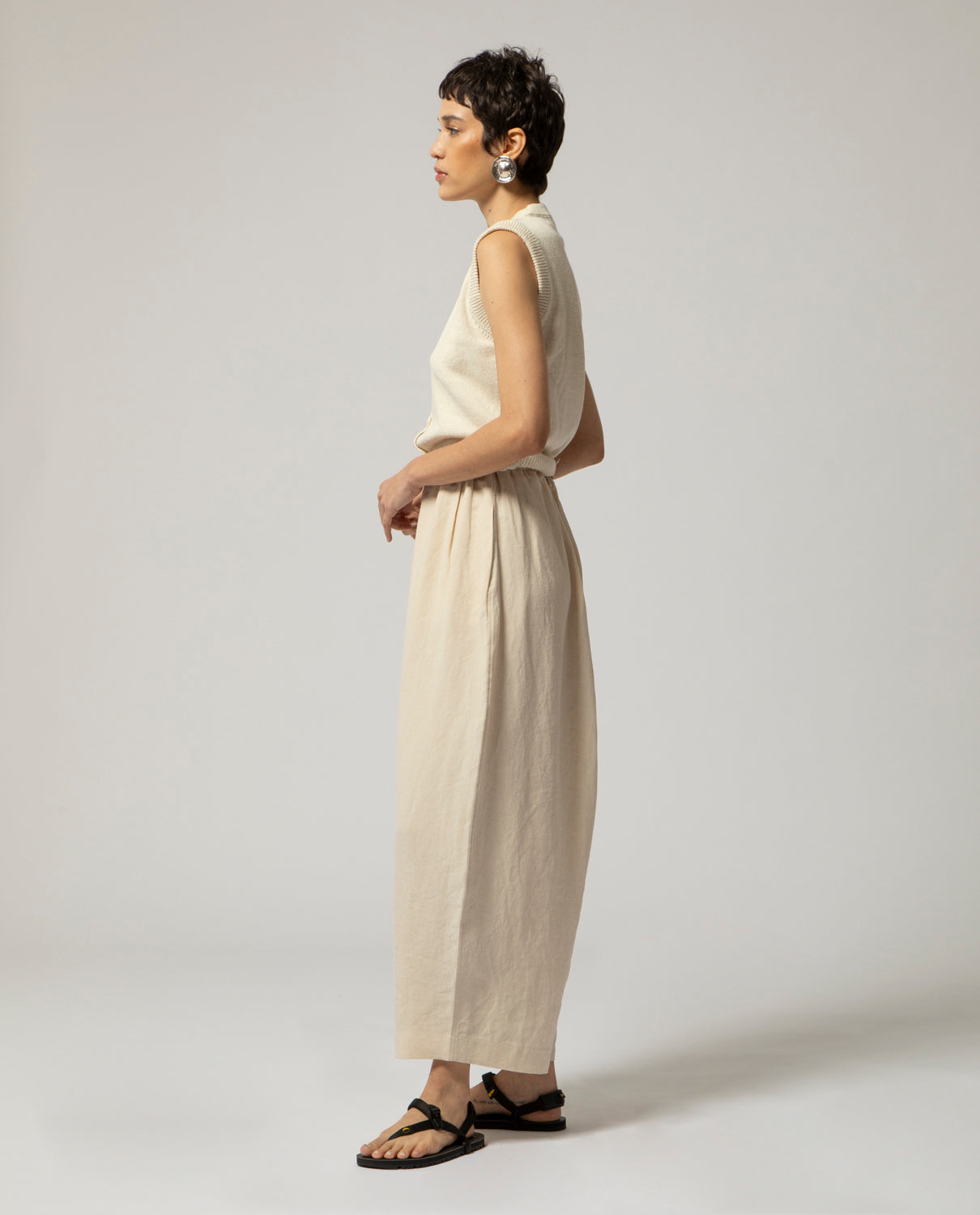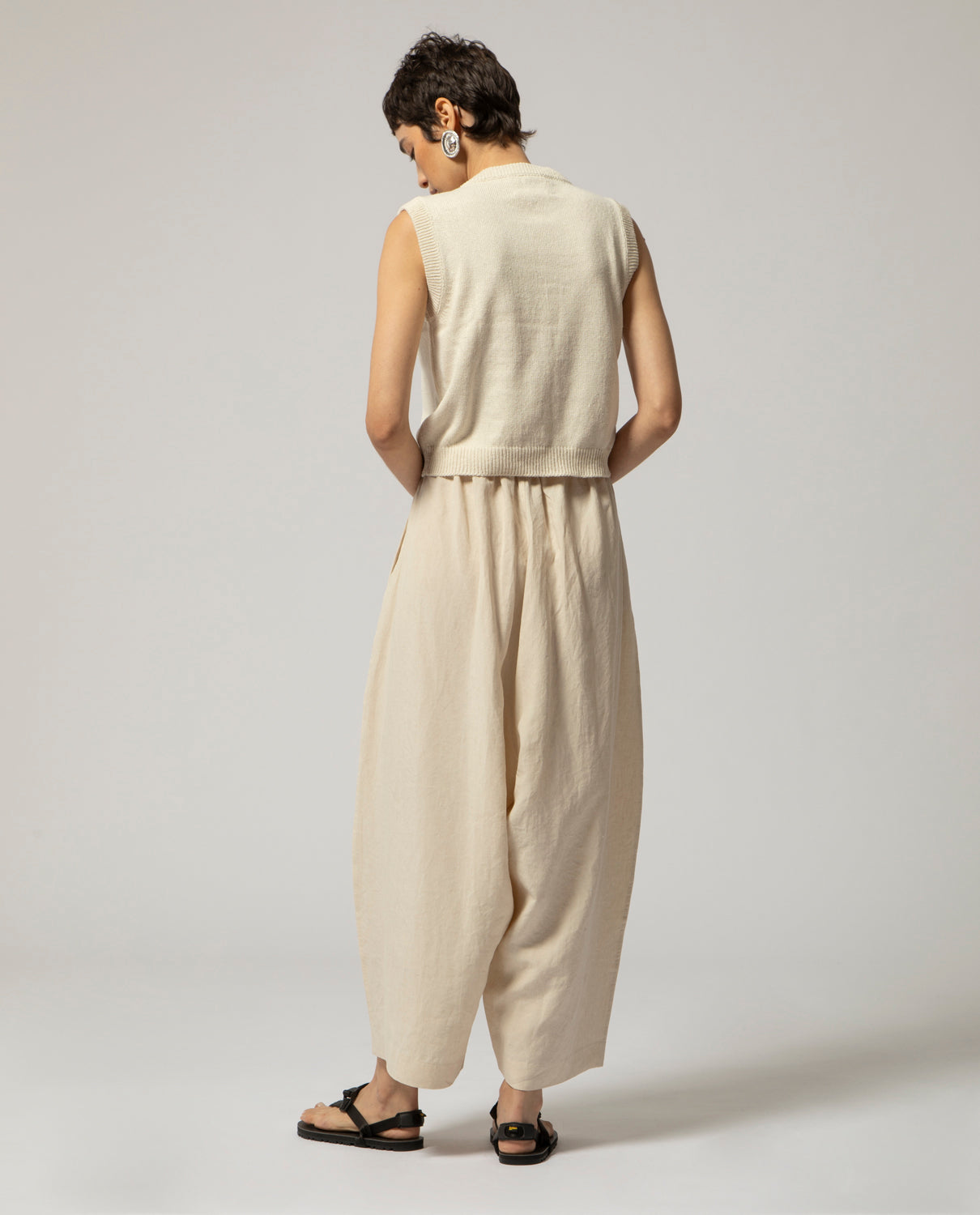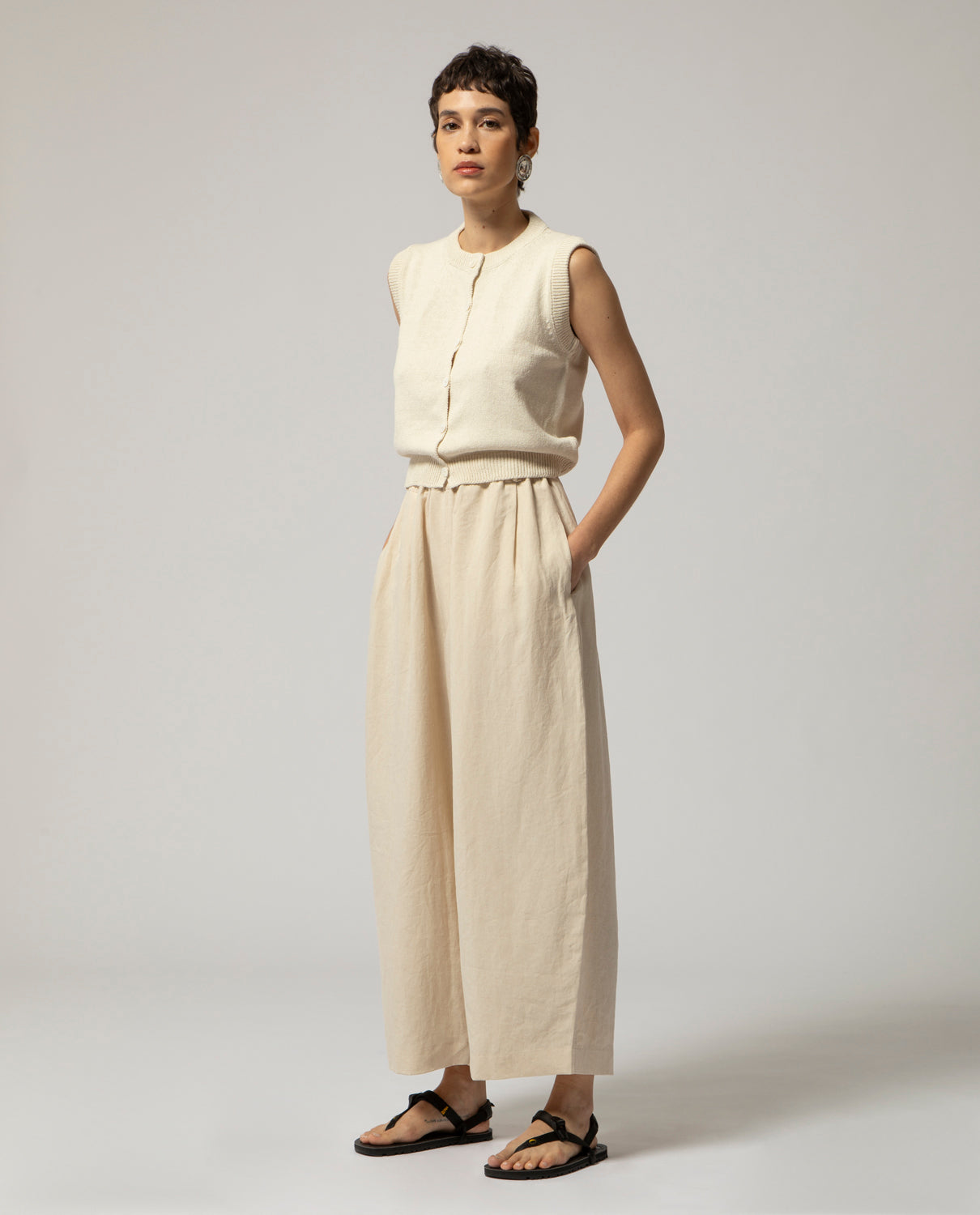 Sleeveless knitted gilet in hemp and silk with elagstic waistband, rounded neckline and front opening with small buttons line-up.