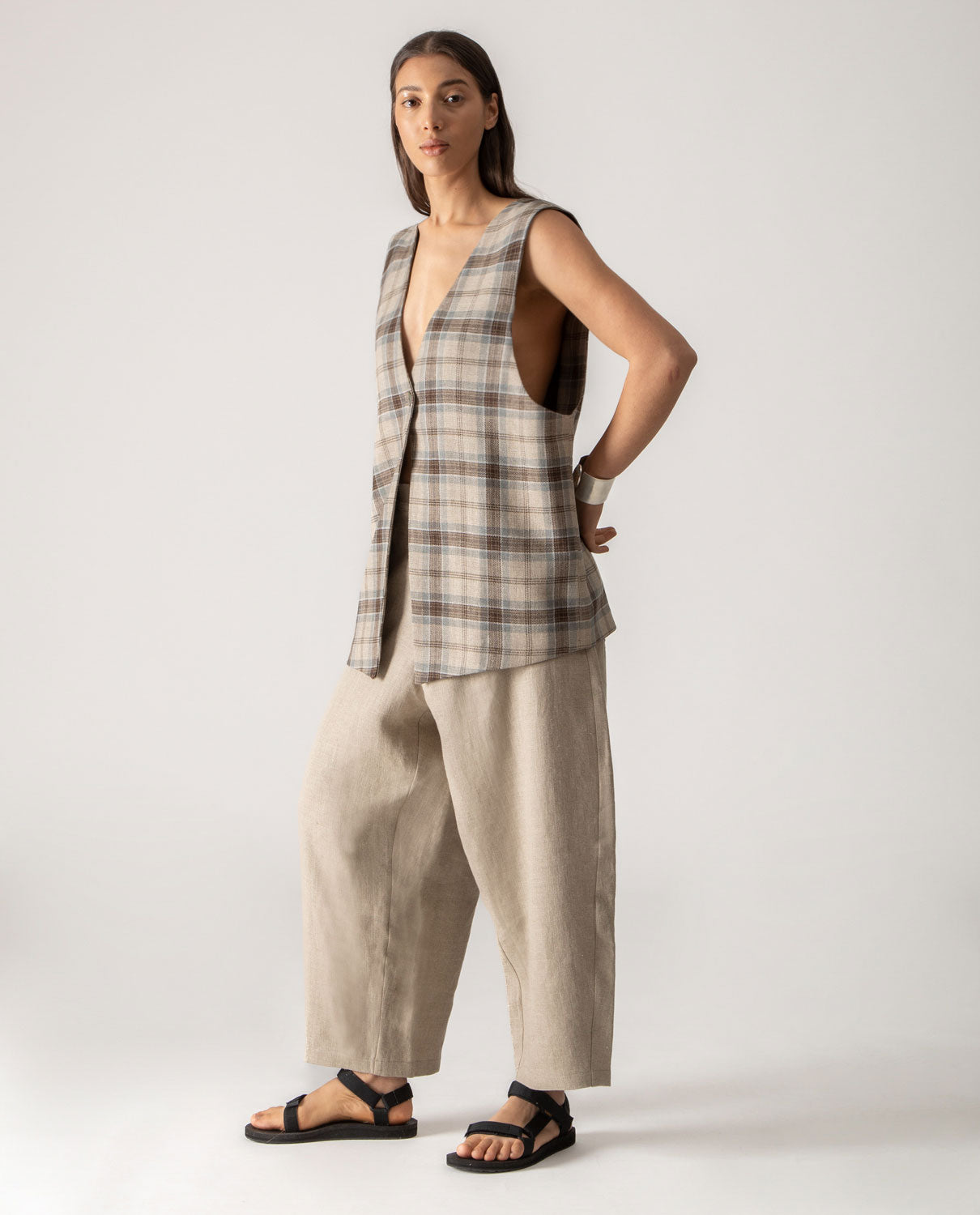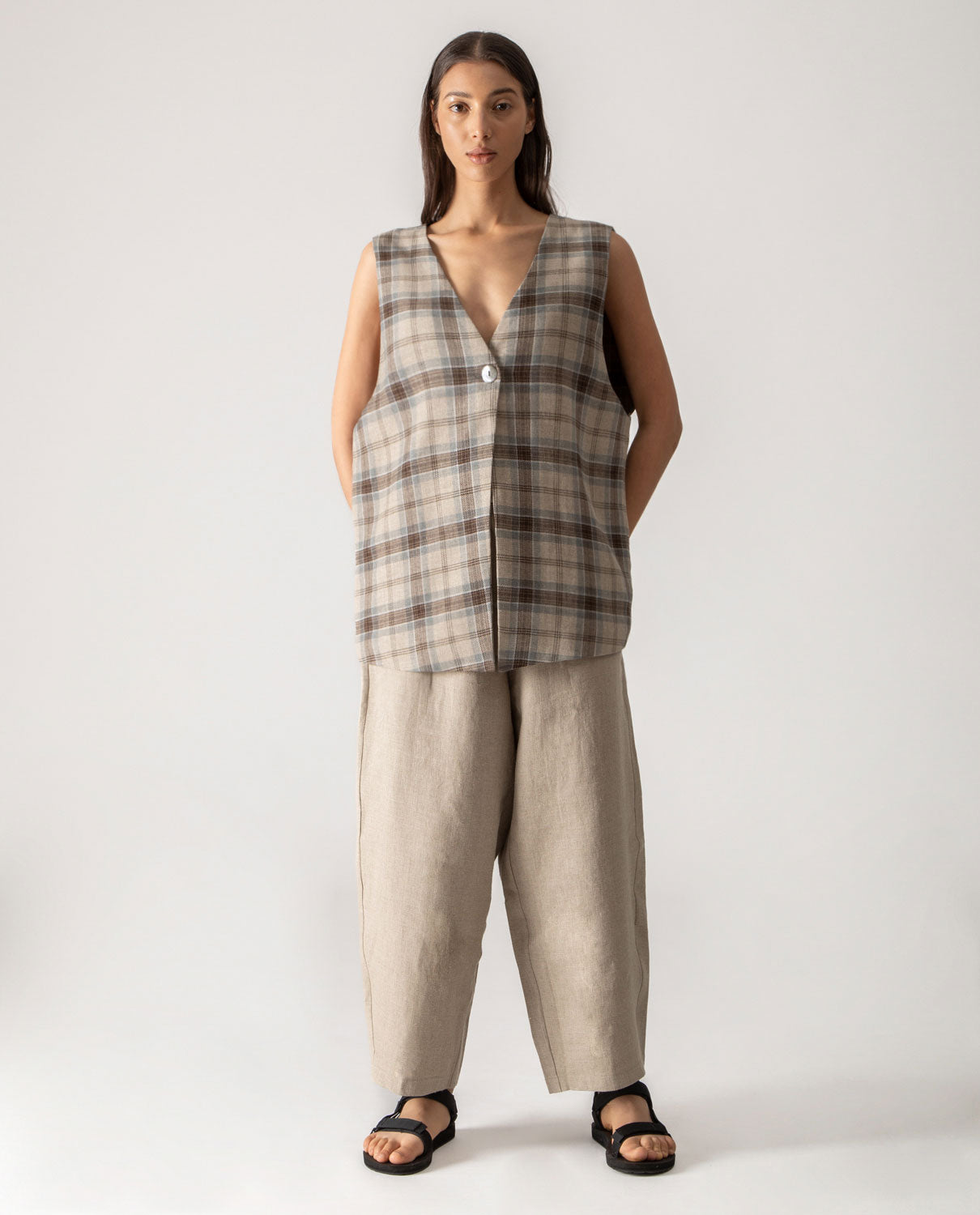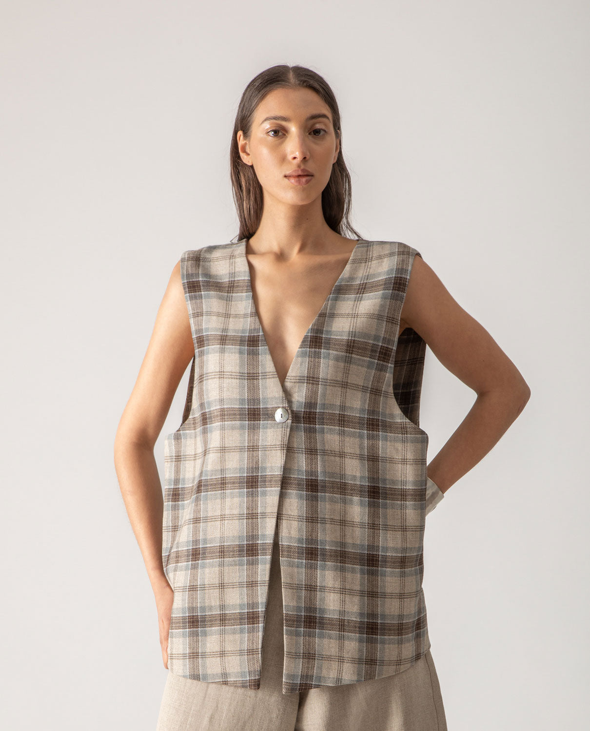 Menswear-inspired oversized gilet with handcrafted button in jute string.