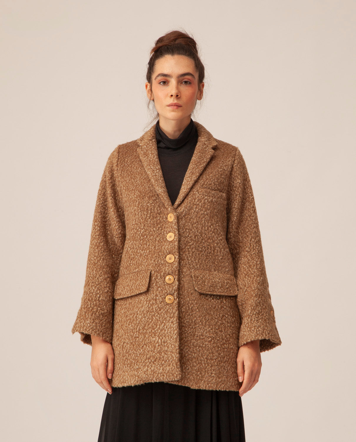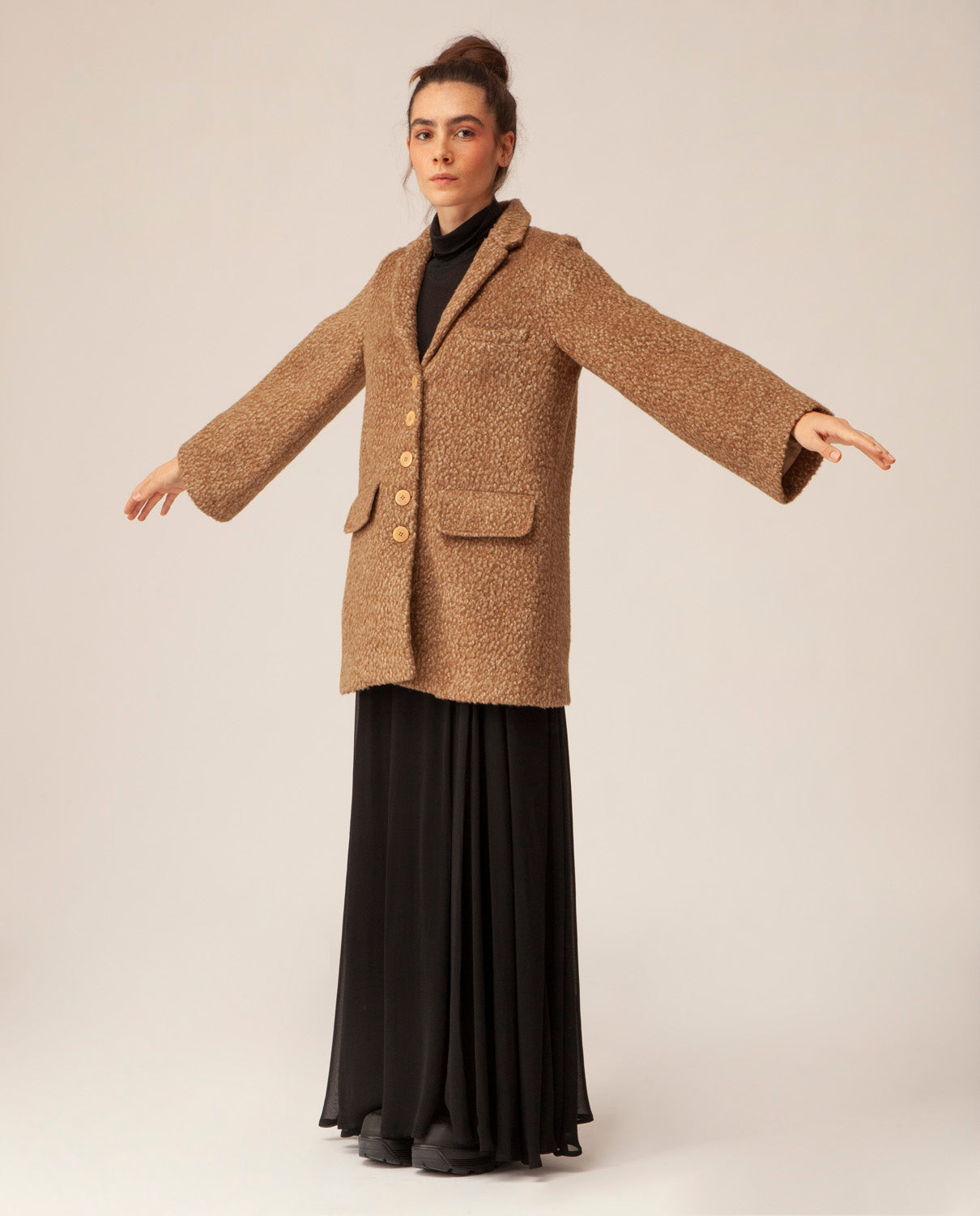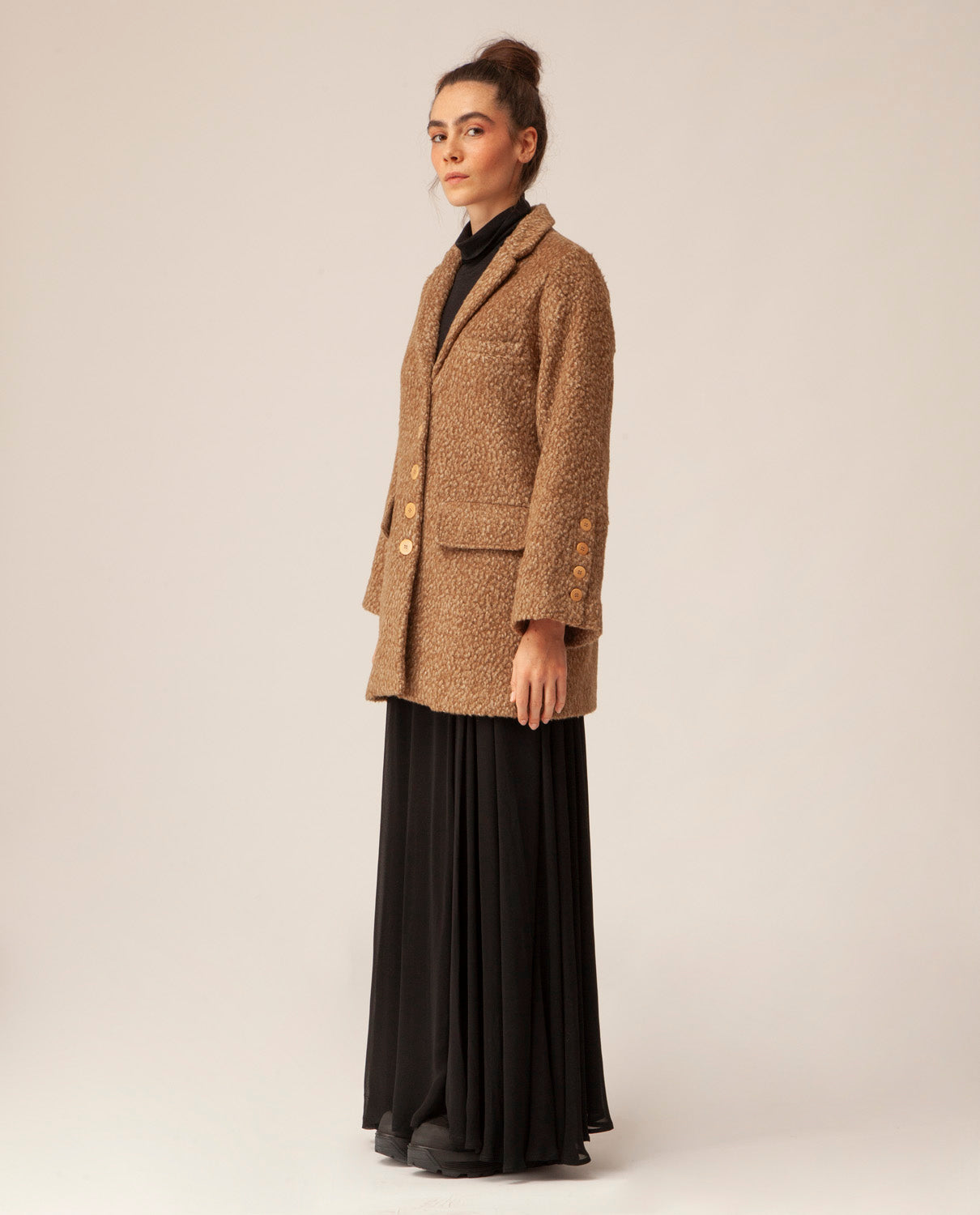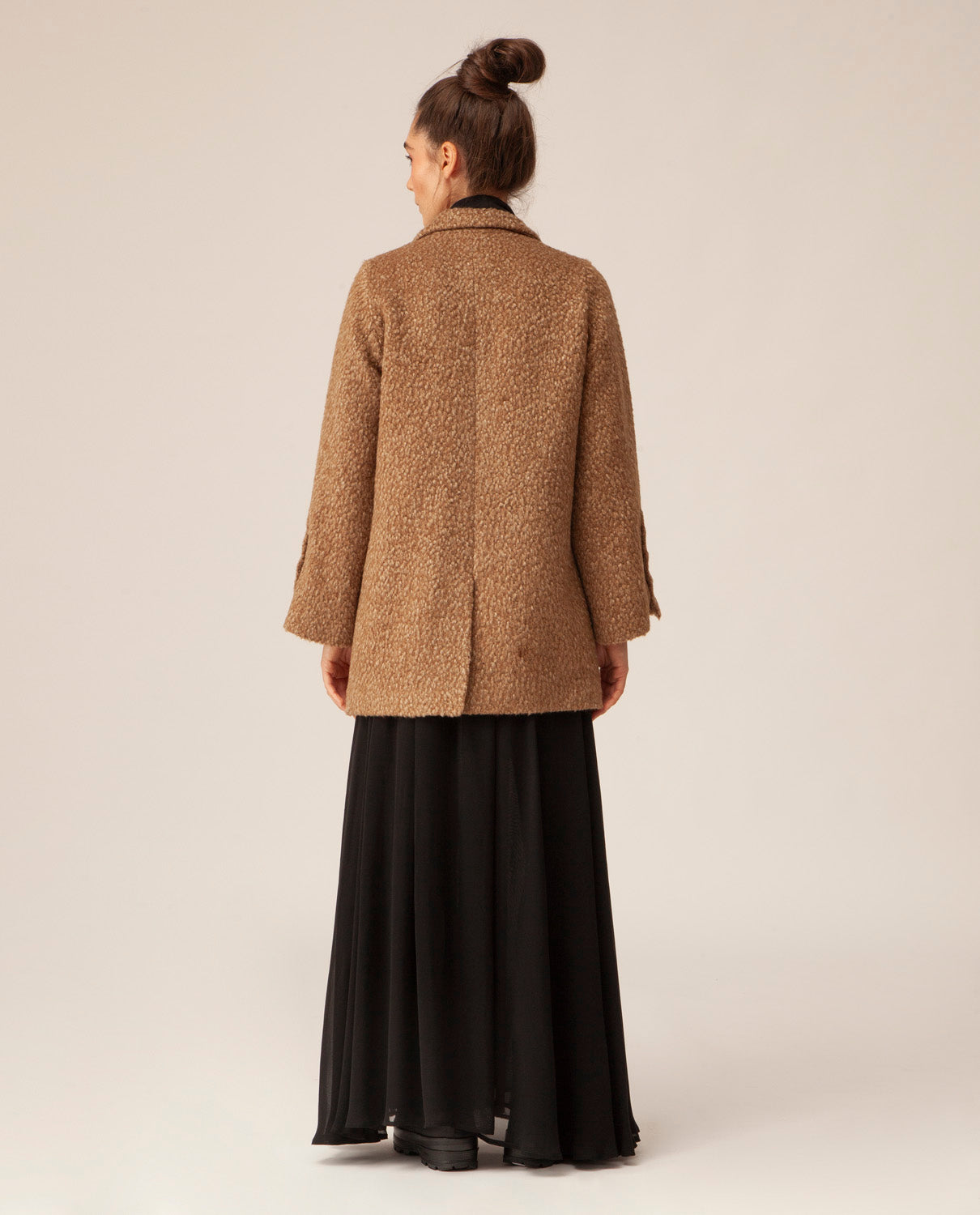 Half-length coat in wool and cashmere with front button closure. It features small lapels, flared sleeves with buttons.