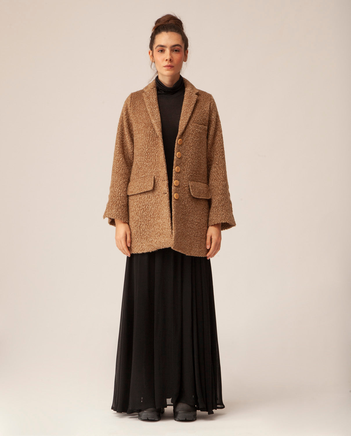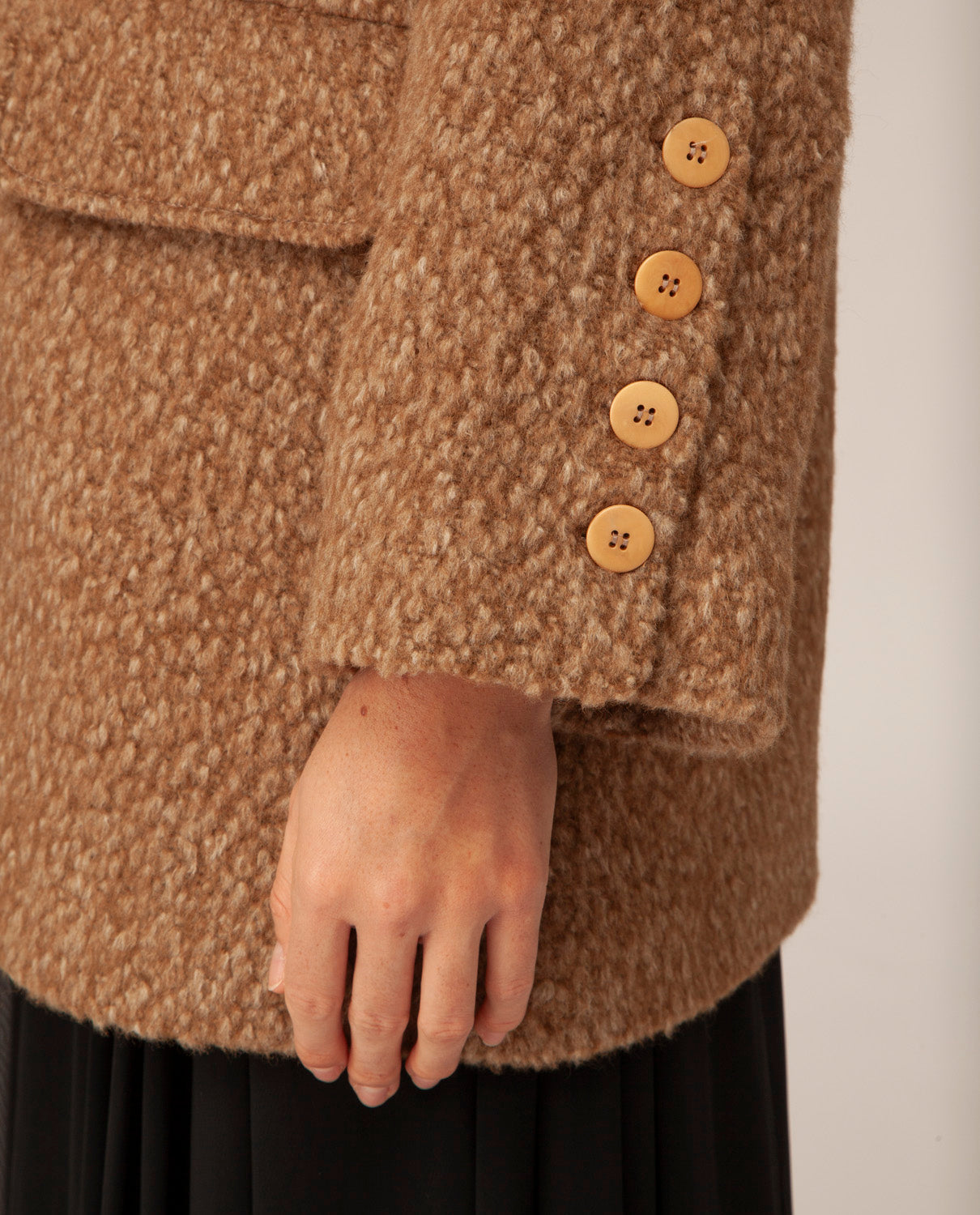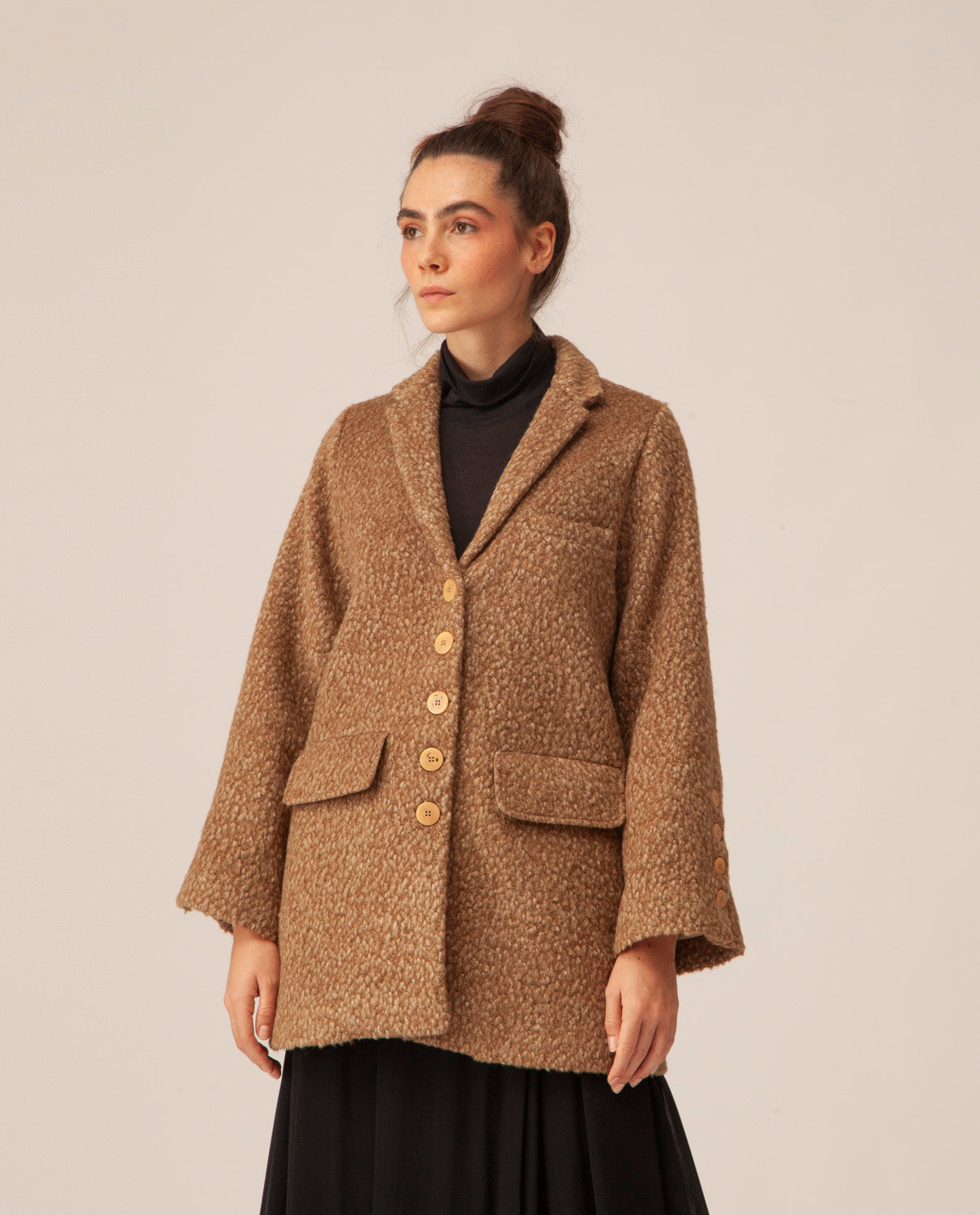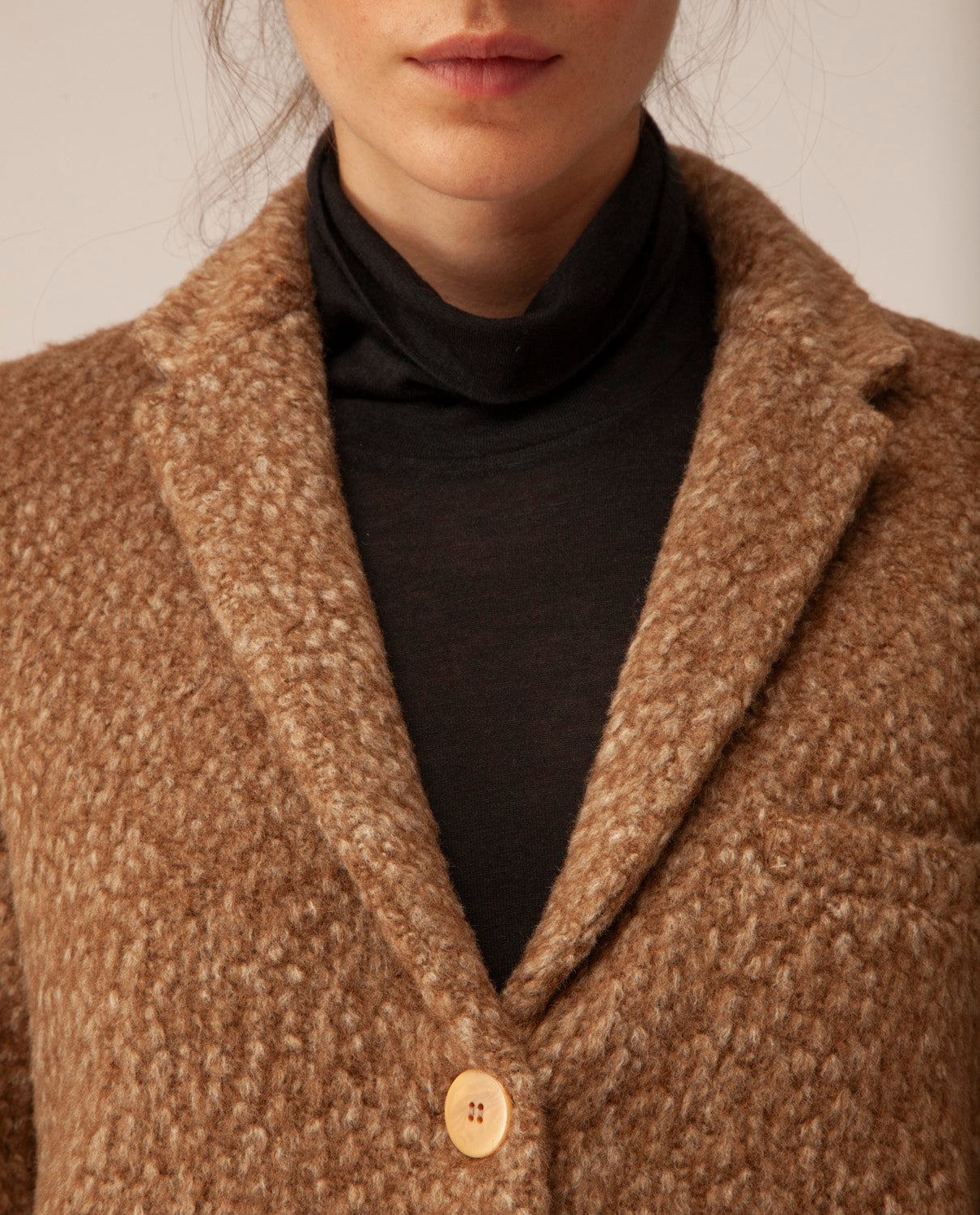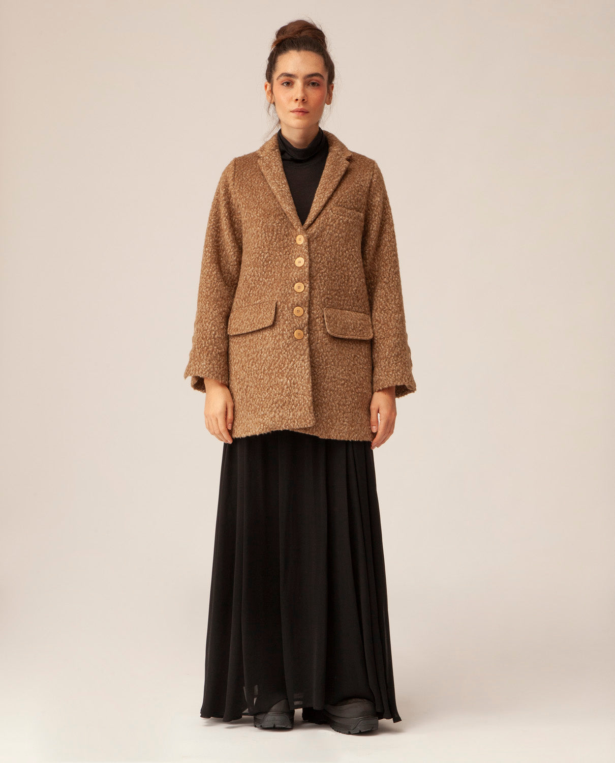 Half-length coat in wool and cashmere with front button closure. It features small lapels, flared sleeves with buttons.