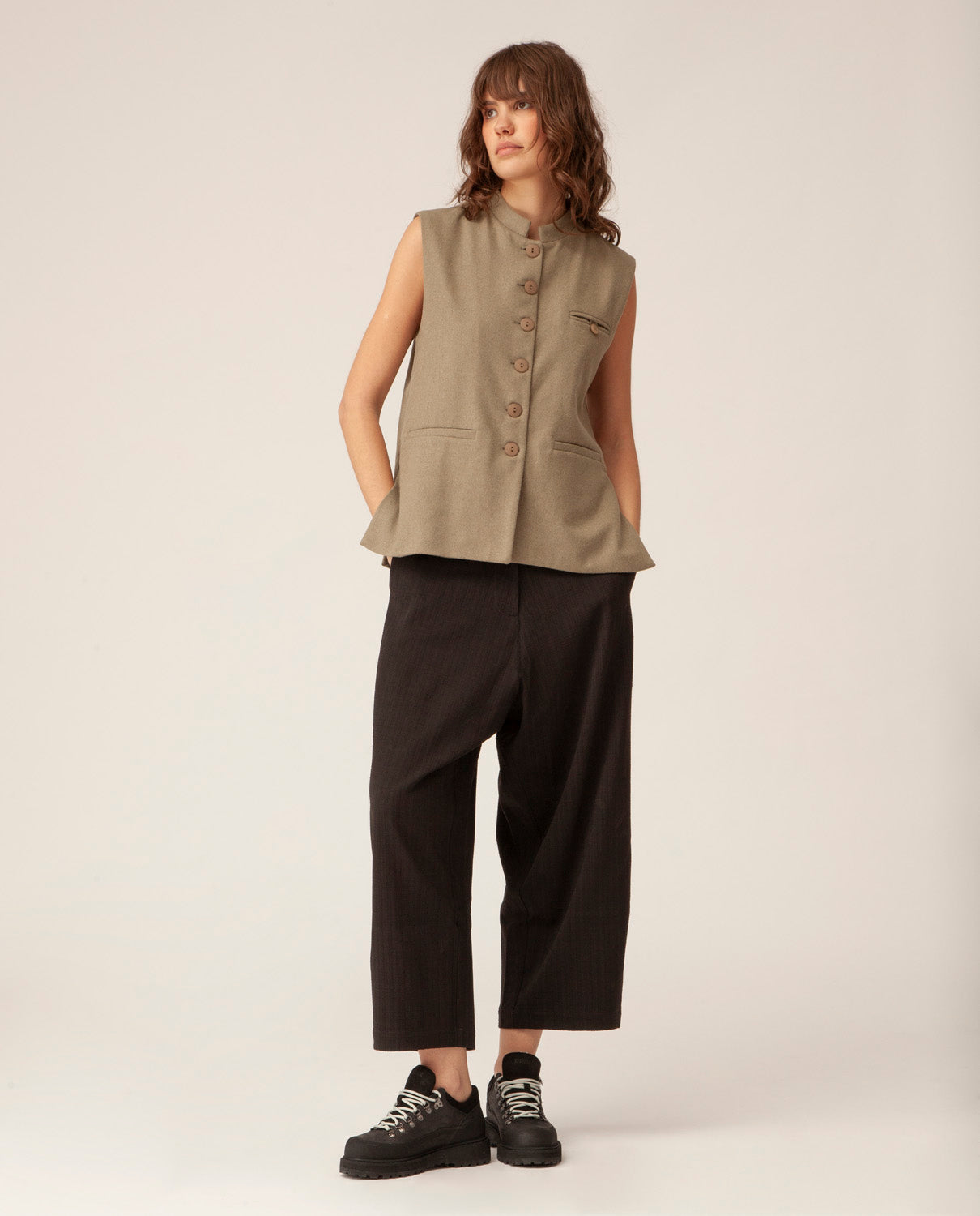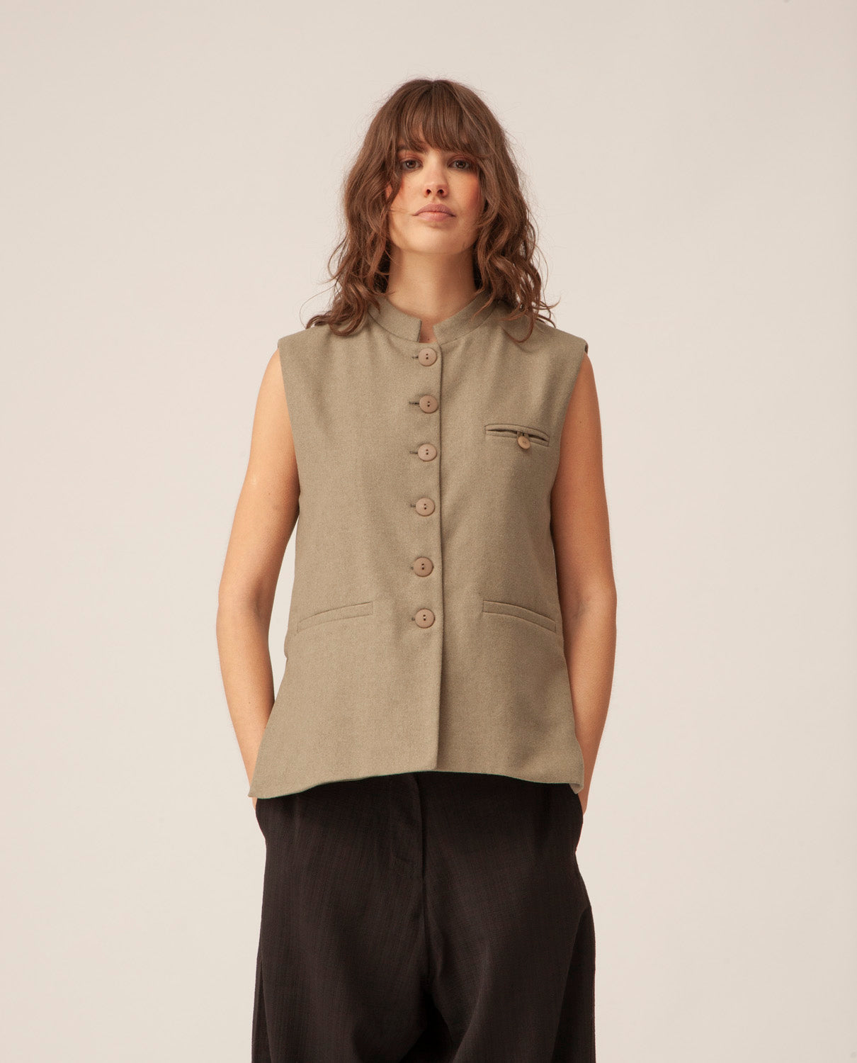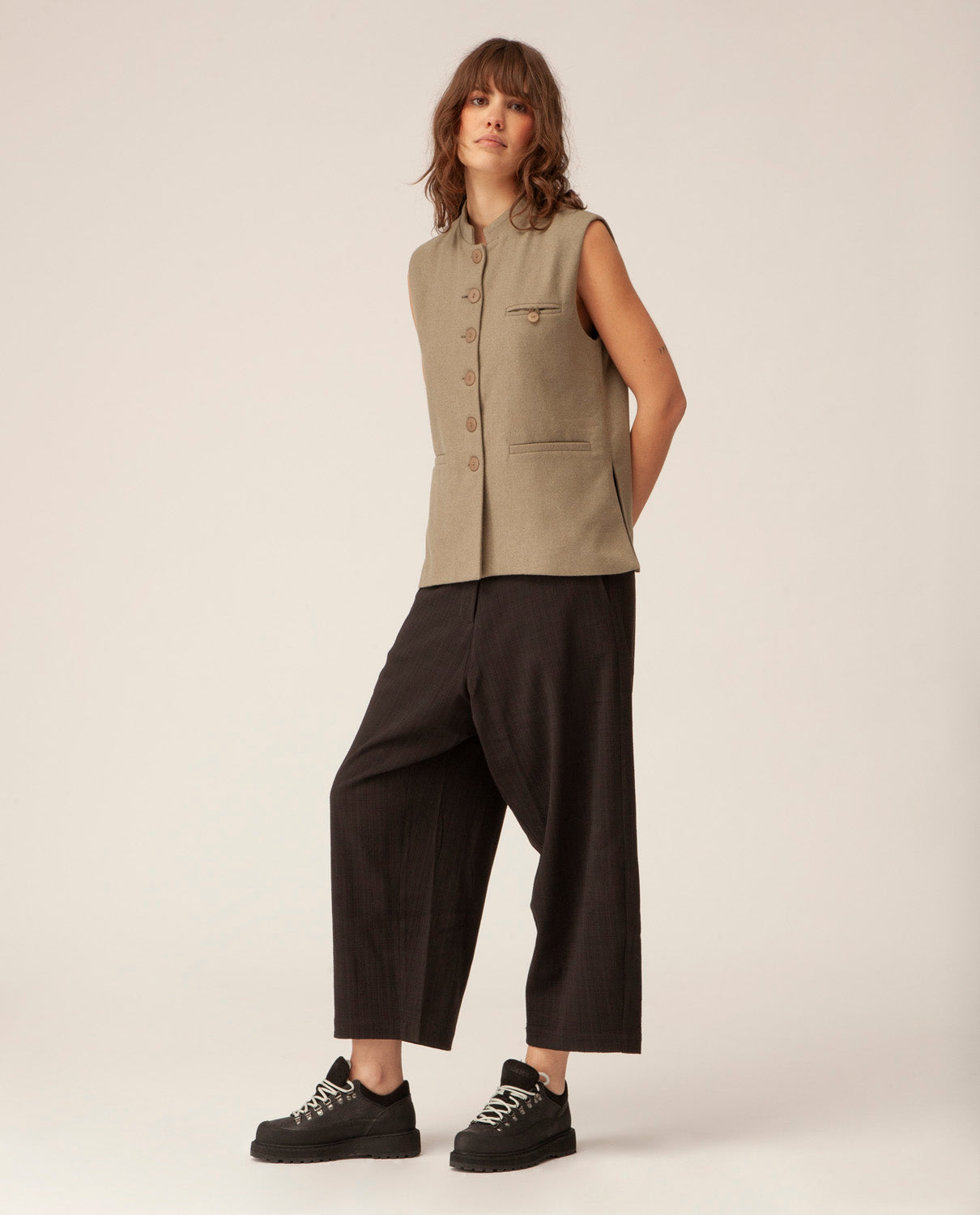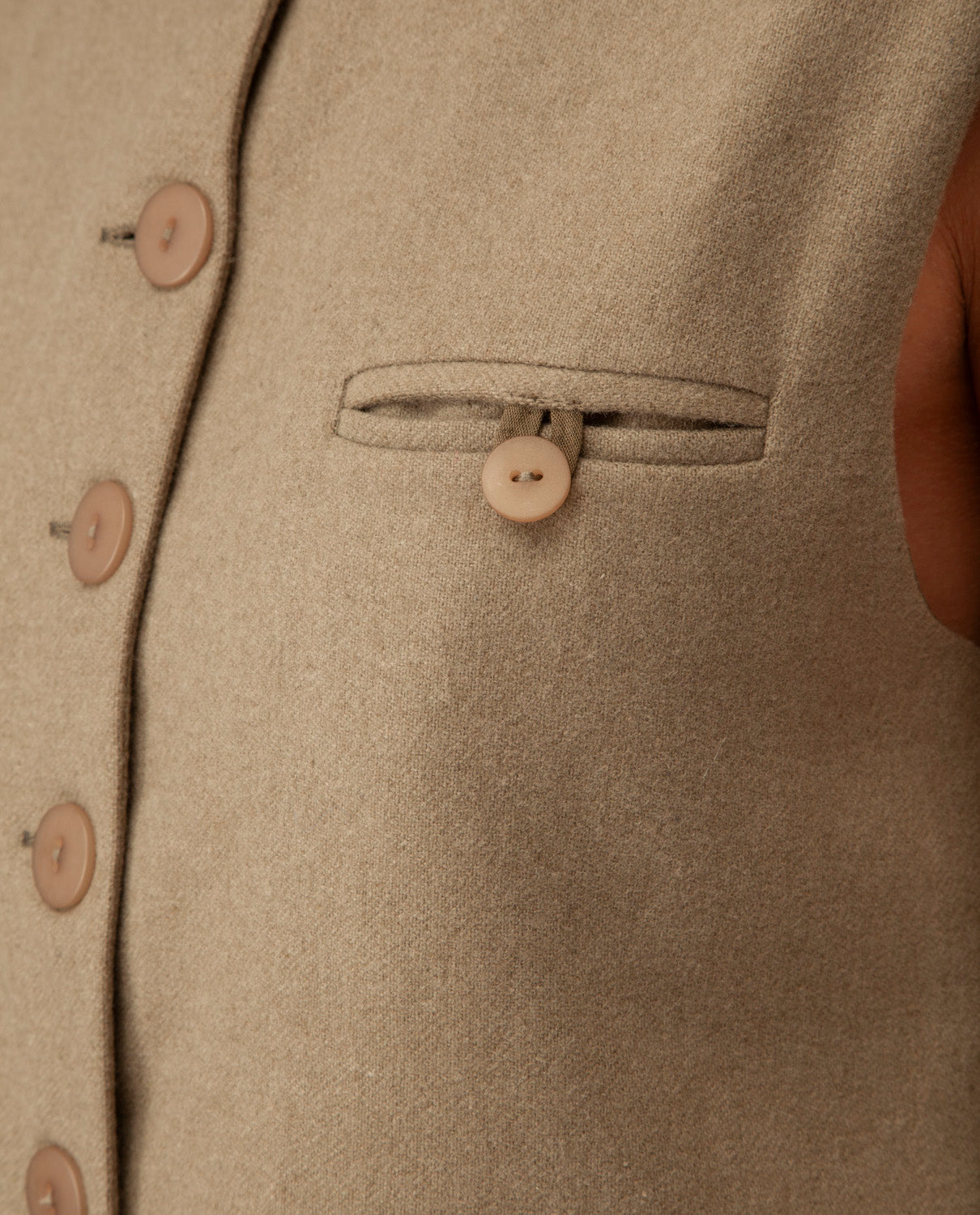 Tailored waistcoat drawing inspiration from the classic male vests of the Far East. The garment features a Korean collar, three concealed pockets, and small side slits for added functionality.