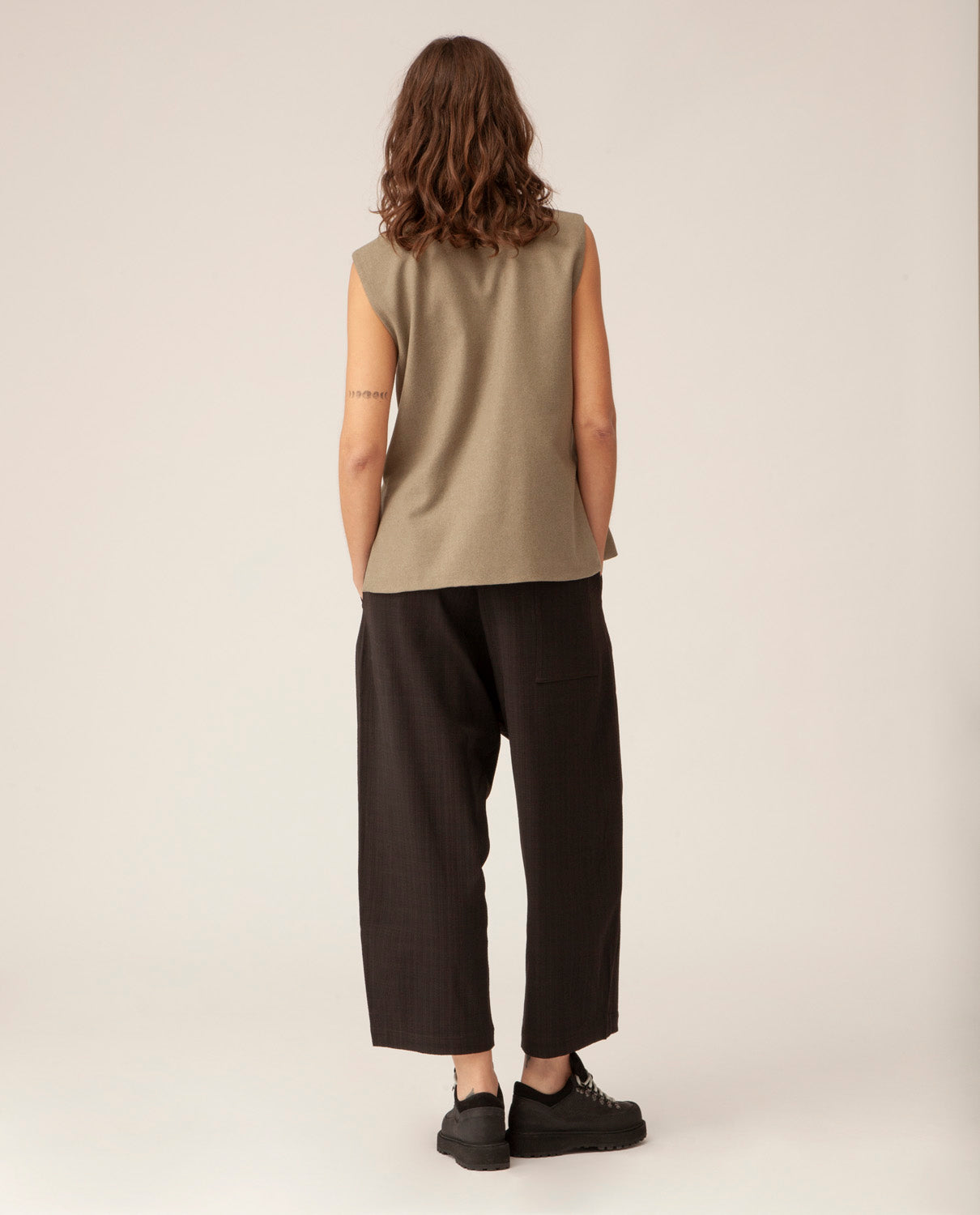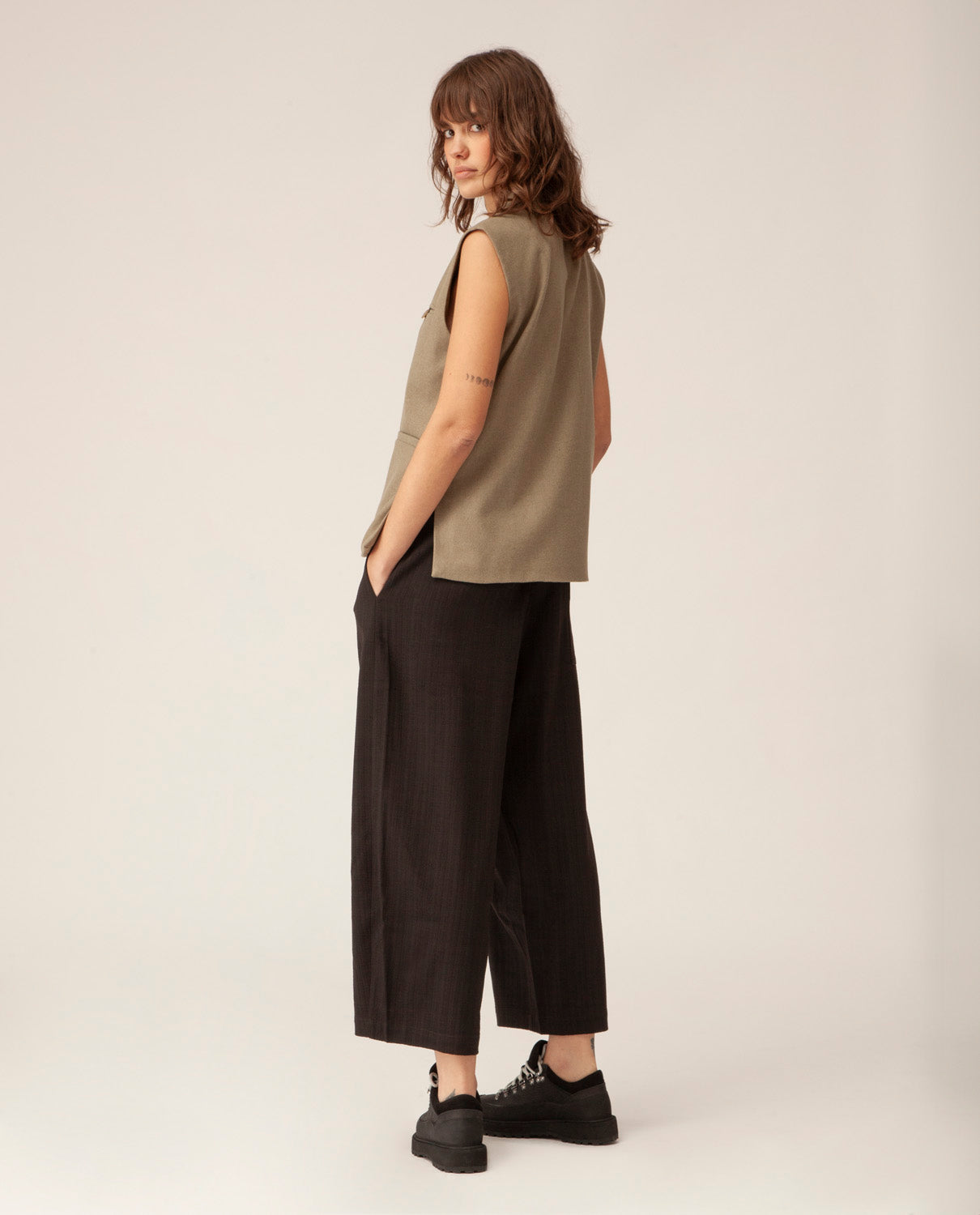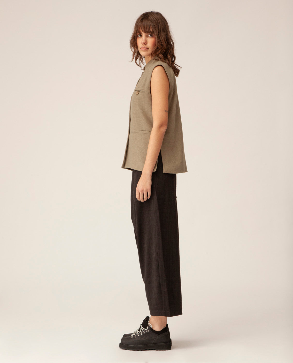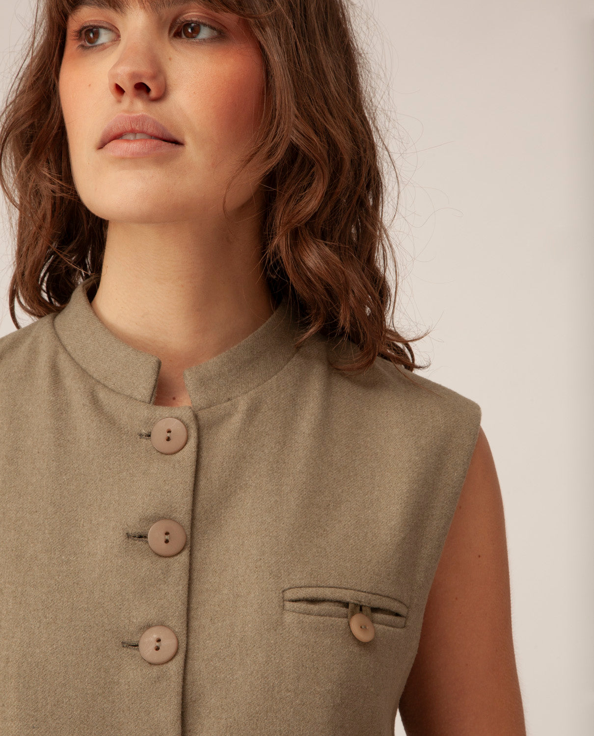 Tailored waistcoat drawing inspiration from the classic male vests of the Far East. The garment features a Korean collar, three concealed pockets, and small side slits for added functionality.