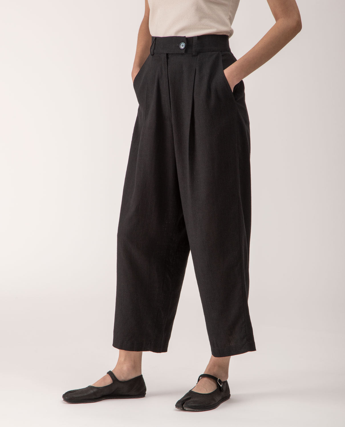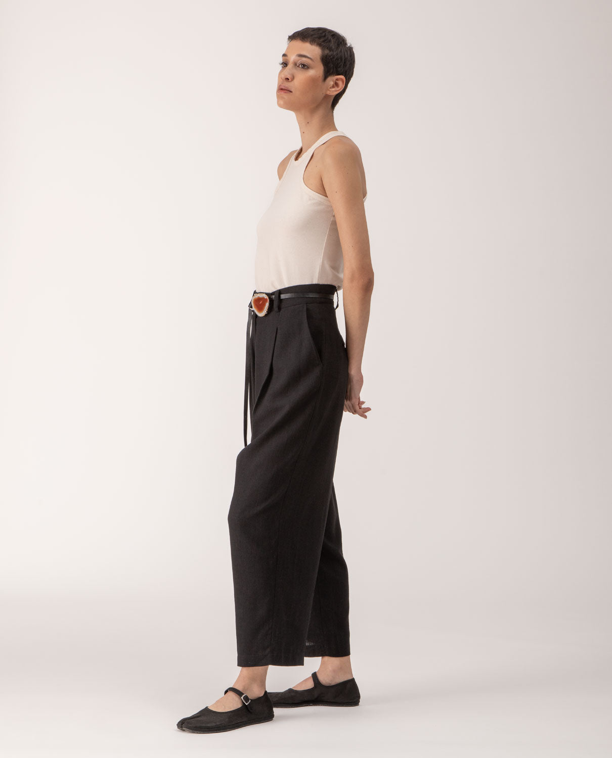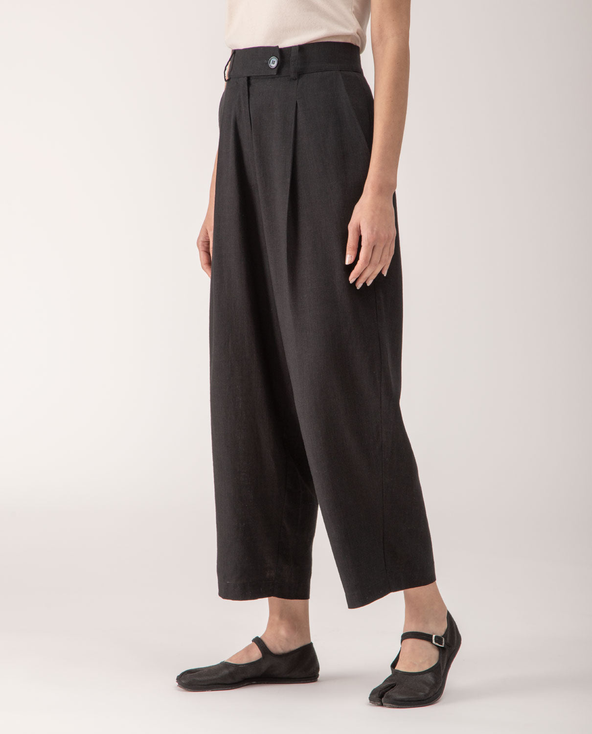 Ankle-long trousers with front pleats and belt loops.