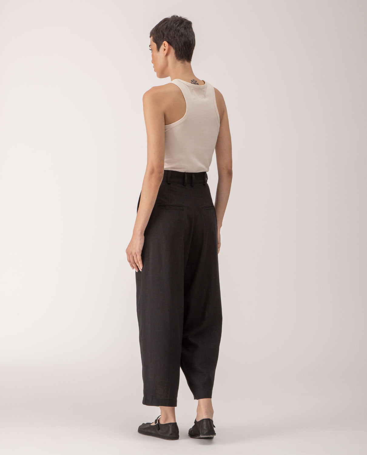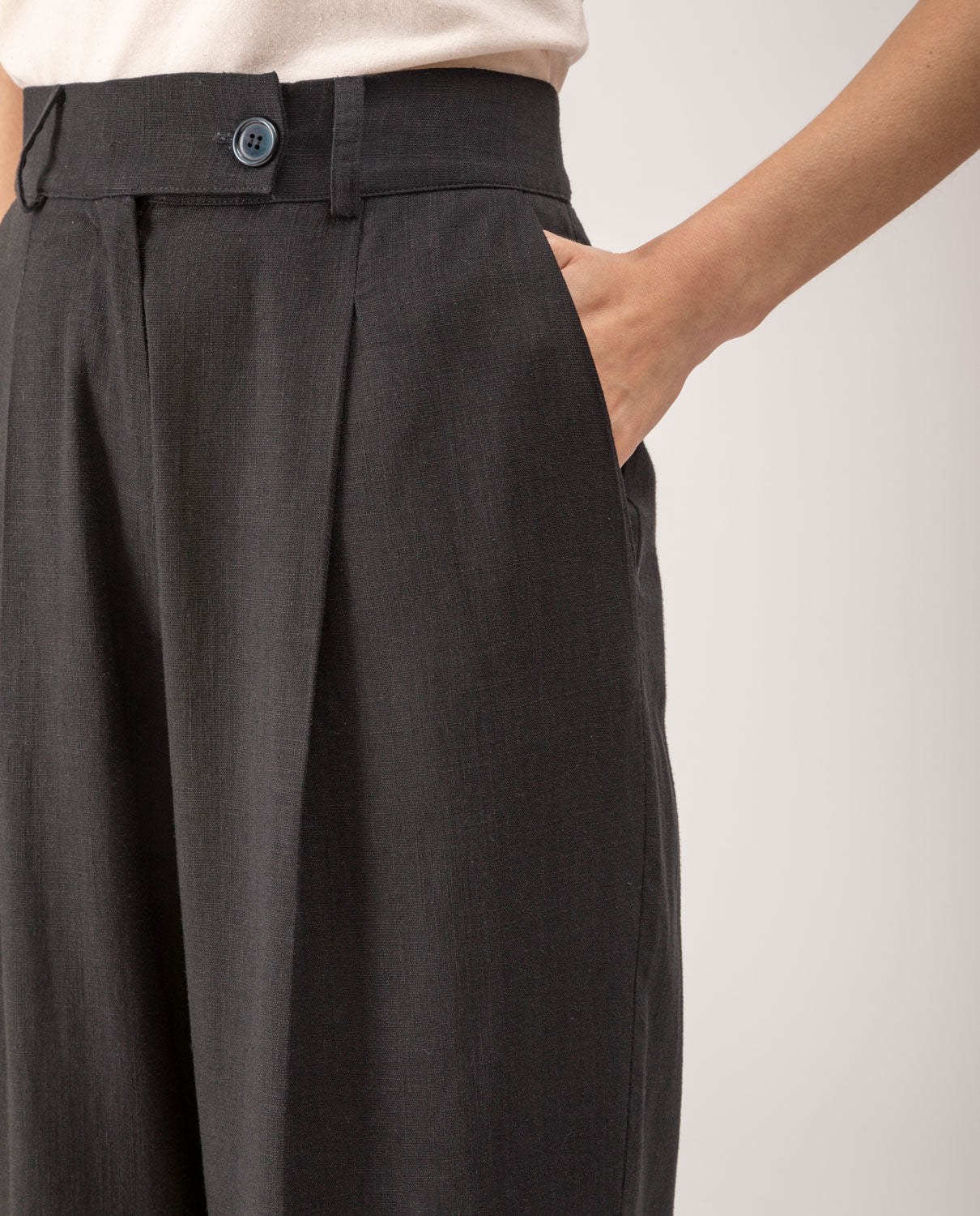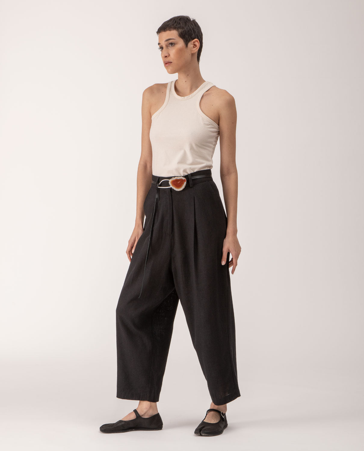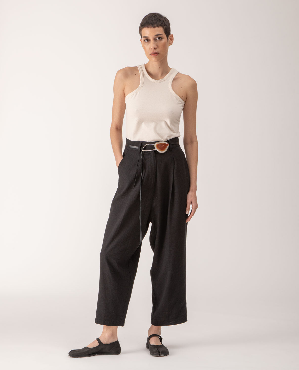 Ankle-long trousers with front pleats and belt loops.